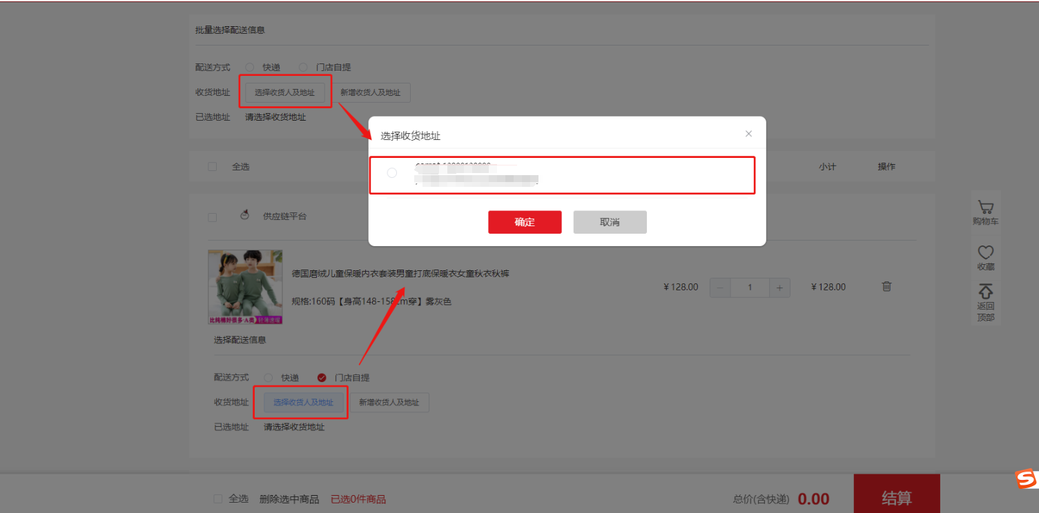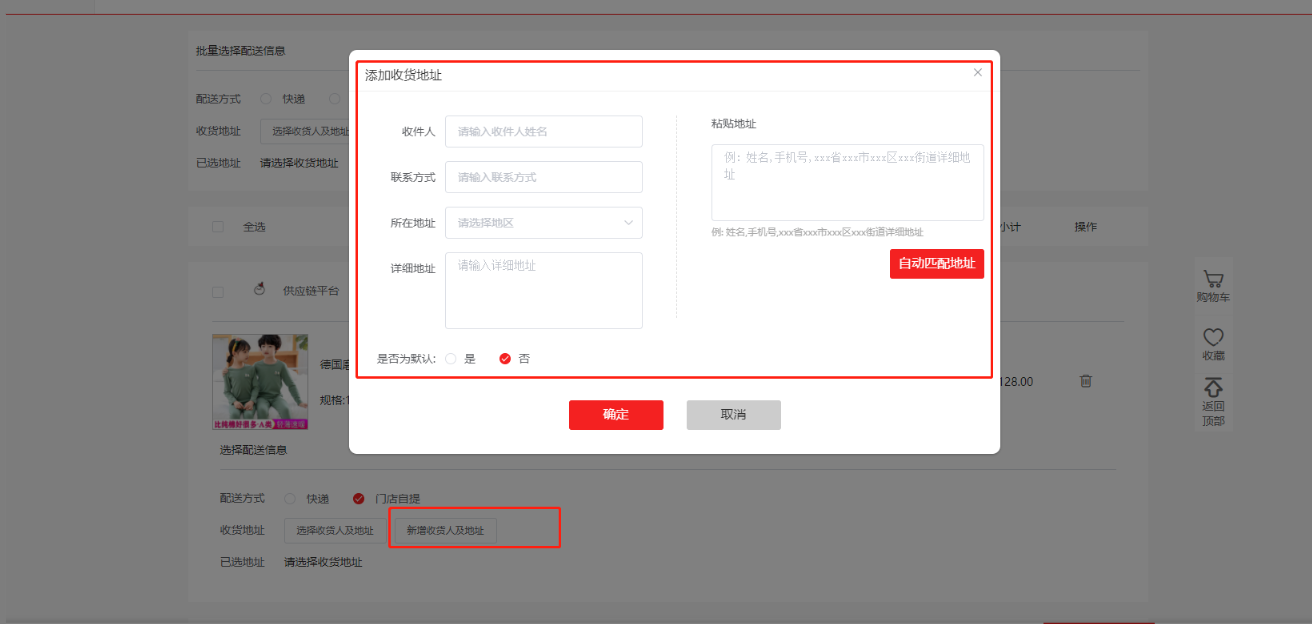 1)收货地址调整方式有两个最上面的,是直接调整所有商品的收货方式,每个商品单独的代表带单独的收货地址,如果没有收货地址可点击新增进行新增。