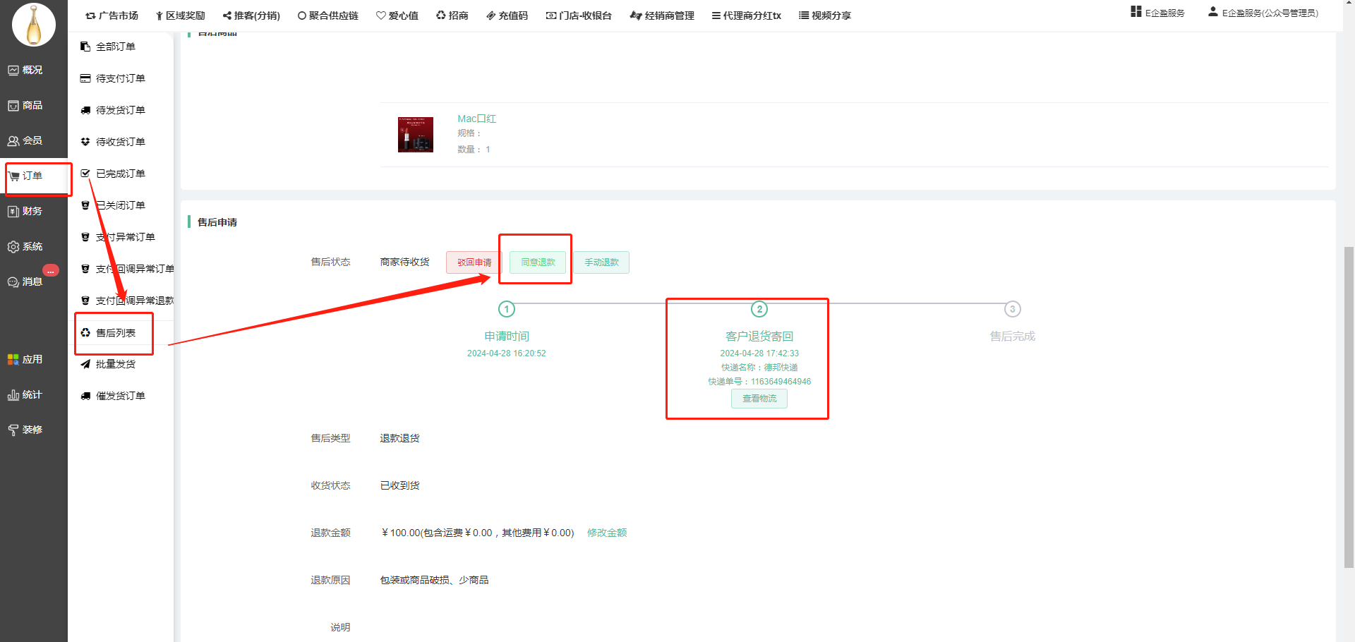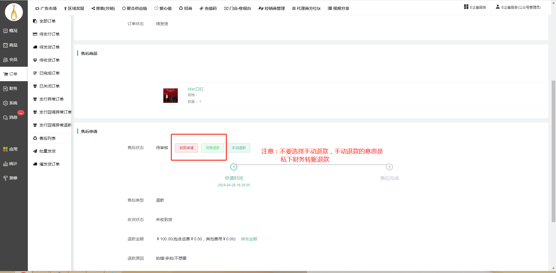 4、审核:要么选择驳回申请,要么选择同意退款(退款方式则原路返回,无则需要您用其他方式进行退款)