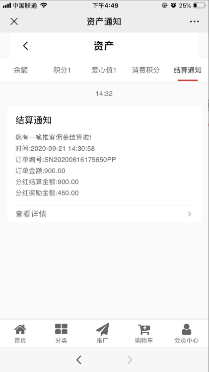 用户在前端会员中心--消息栏目中可以查看交易物流、提现通知、申请通知、客户通知、资产通知、服务通知、订单提醒、客服通知、后台推送的活动优惠等信息。