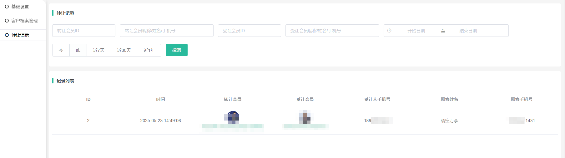 1,会员在前端可通过手机号转让顾客档案,此处显示转让记录