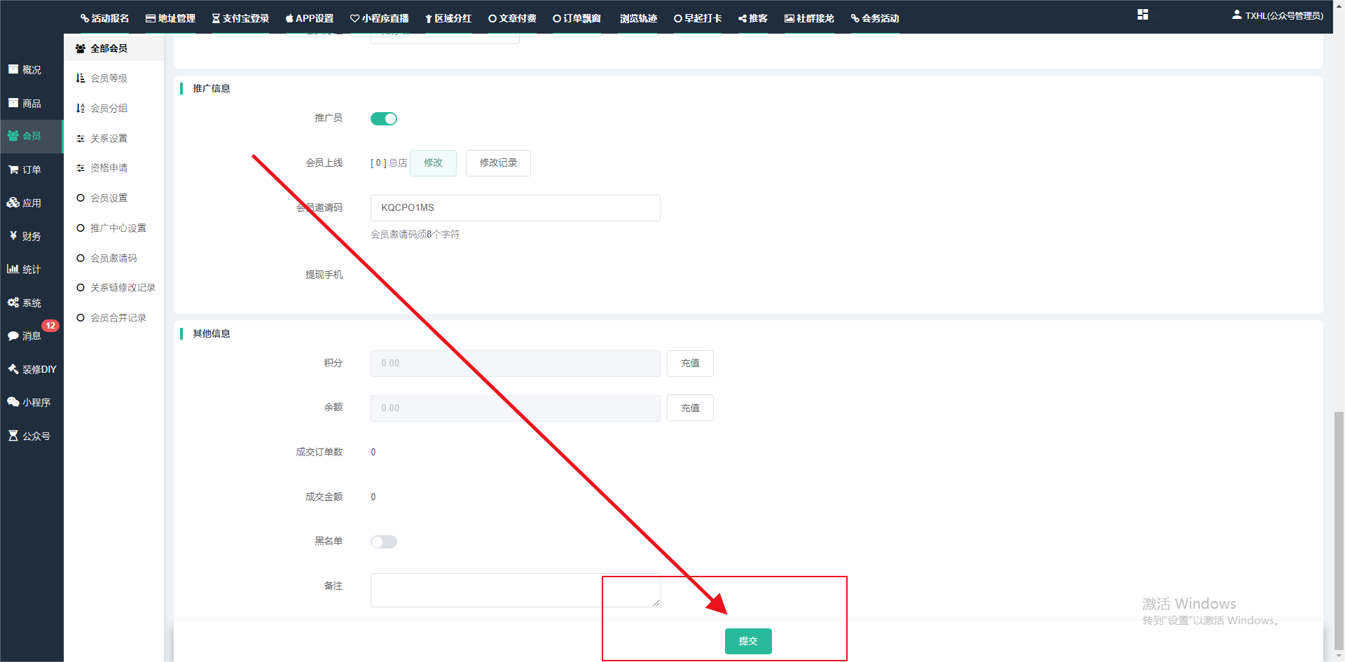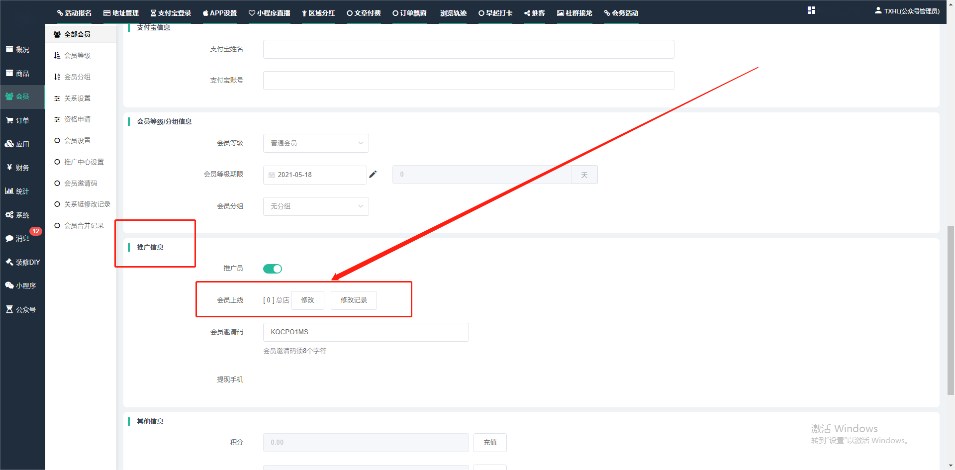 目录 搜索 展开 一、前期准备资料二、数字乡村码-上线操作指南1、服务号的申请流程及认证2、申请小程序流程3、开放平台绑定小程序和公众号三、数字乡村码-系统操作数字乡村码系统管理-概况数字乡村码-商品管理1、发布商品2、商品列表3、商品表单4、商品分类5、品牌管理6、配送模板7、评论管理8、优惠券管理9、商品标签10、退货地址设置11、满额优惠12、批量操作13、配送方式14、基础设置15、商品隐藏四、数字乡村码-会员管理1、全部会员2、会员等级3、会员分组4、资格申请5、会员设置6、推广中心设置7、会员邀请码8、会员关系链修改关系链修改记录9、会员合并记录10、账号注销管理11、会员设置中心五、数字乡村码-订单管理1、订单管理列表2、订单处理流程3、订单状态4、订单修改价格5、订单退款退货6、多包裹发货7、批量发货订单操作步骤8、催发货订单9、物流查询六、数字乡村码-财务管理1、余额设置2、会员余额3、充值记录4、转让记录5、余额明细6、收入明细7、提现设置8、提现统计9、积分管理10、转账审核11、收益广告12、批量充值七、数字乡村码-系统管理1、商城入口2、商城设置①、商城设置②、订单设置③、物流查询④、短信⑤、联系方式⑥、分类⑦、优惠券⑧、分享⑨、幻灯片⑩、广告位⑫、地图设置3、交易设置4、微信模板消息自定义消息模板(新版)自定义消息模板(旧版)小程序消息模板公众号模板消息变更公告5、语言设置6、权限管理7、多媒体管理八、数字乡村码-消息管理九、数字乡村码-应用管理十、数字乡村码系统-数据统计十一、数字乡村码-页面装修DIY1、模板管理2、店铺页面3、顶部导航4、底部导航5、DIY模板市场6、首屏广告7、基础设置8、装修DIY尺寸建议十二、供应商功能插件操作指南1、供应商2、门店-收银台门店申请和使用步骤门店管理①、门店-收银台 营销设置②、门店-收银台 分润设置门店分类门店申请门店审核门店商品门店商品订单收银台订单数据统计核销员基础设置默认设置门店装修3、微社区4、会务活动十三、营销插件操作指南活动报名提货卡新人奖微店问卷调查积分视频分享1、视频分享基础设置2、视频分享发现管理3、视频分享分类管理4、视频分享评论管理5、视频分享分红记录6、视频分享短视频中心每日红包幸运大抽奖签到优惠券二维码任务奖励优惠劵文章音频文章付费文章限时购新海报拓客卡操作流程积分活动素材中心视频红包十四、入驻门店应用类1、门店预约2、附近商品3、门店定位设置4、门店控制5、门店满额包邮6、门店满额减7、导入商品8、门店搜索9、门店股东10、核销券11、多门店核销1、商城后台设置2、前端功能演示十五、常见问题1、后台登录密码修改流程2、会员-余额,积分,后台如何进行充值与扣除3、如何修改上下级关系4、一种万能的获取商城小程序路径的方法 暂无相关搜索结果! 阅读次数:1425 本文档使用 模王系统 发布 3、如何修改上下级关系 如何修改上下级关系一.如何修改上下级关系?1.会员-全部会员-可以通过搜索用户的独立ID,或者用户微信昵称,找到此会员,然后点击右边的(操作)2.再点击会员详情。3.滑到下面,有个推广信息-会员上线,点击修改4.输入上级的ID号,点击搜索,出来此上级会员后点击选择。5.滑到最下面,一定要点击提交按钮。文档更新时间: 2024-01-05 14:50 作者:链上旅行