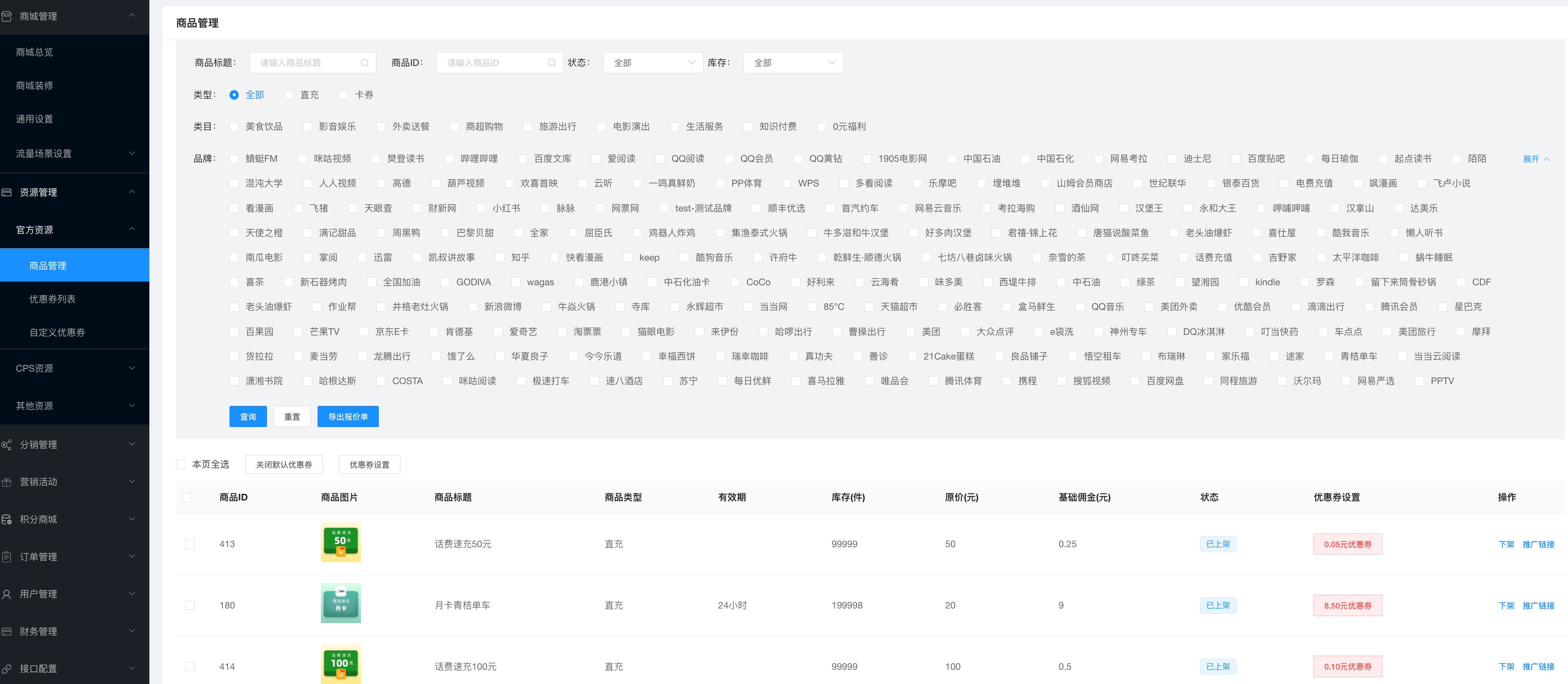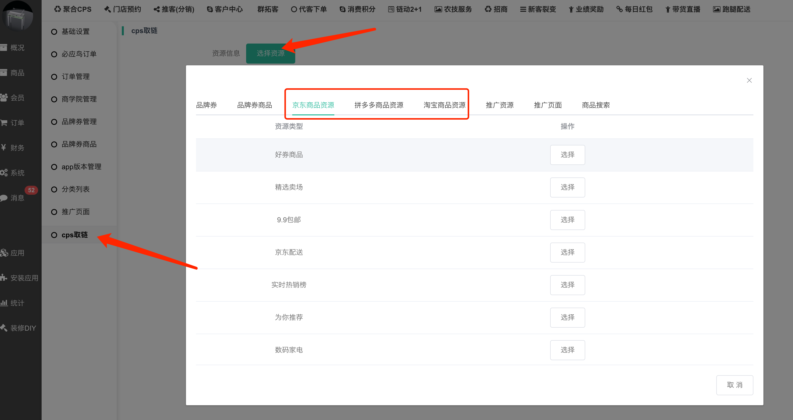 可在演示站点--聚合CPS插件--CPS取链中查看支持的第三方平台推广资源: