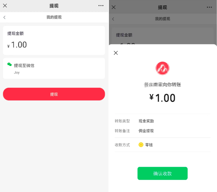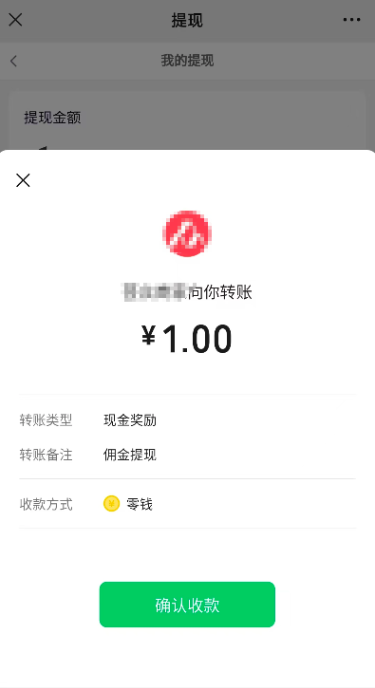 点击确认收款跳转到我的提现页面,点击提现则会弹出确认收款的页面(弹窗里的转账类型:现金奖励就是商户申请时选择的转账场景)