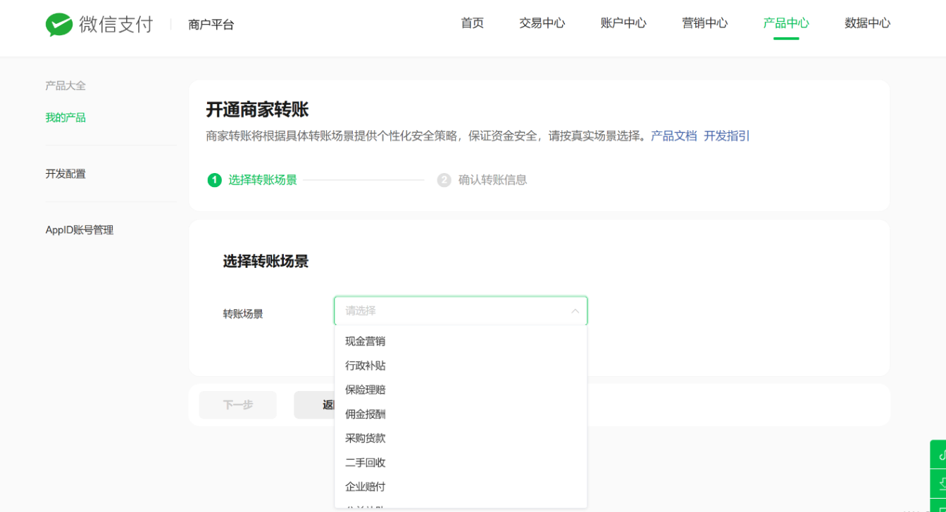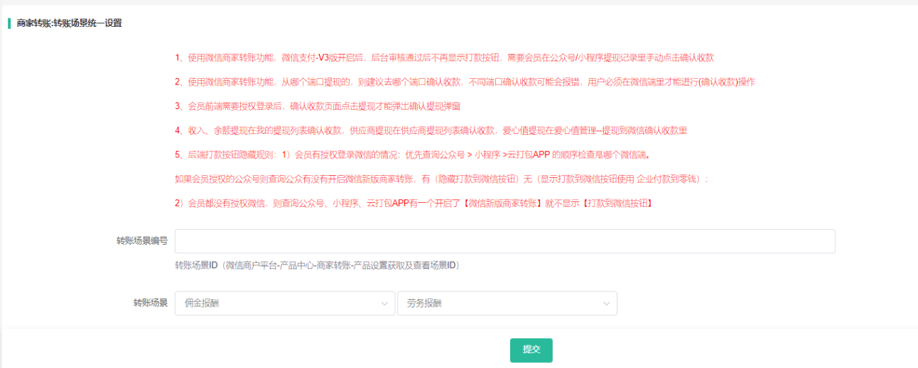 商家转账:转账场景统一设置,填写相关配置,根据实际申请的场景填写
