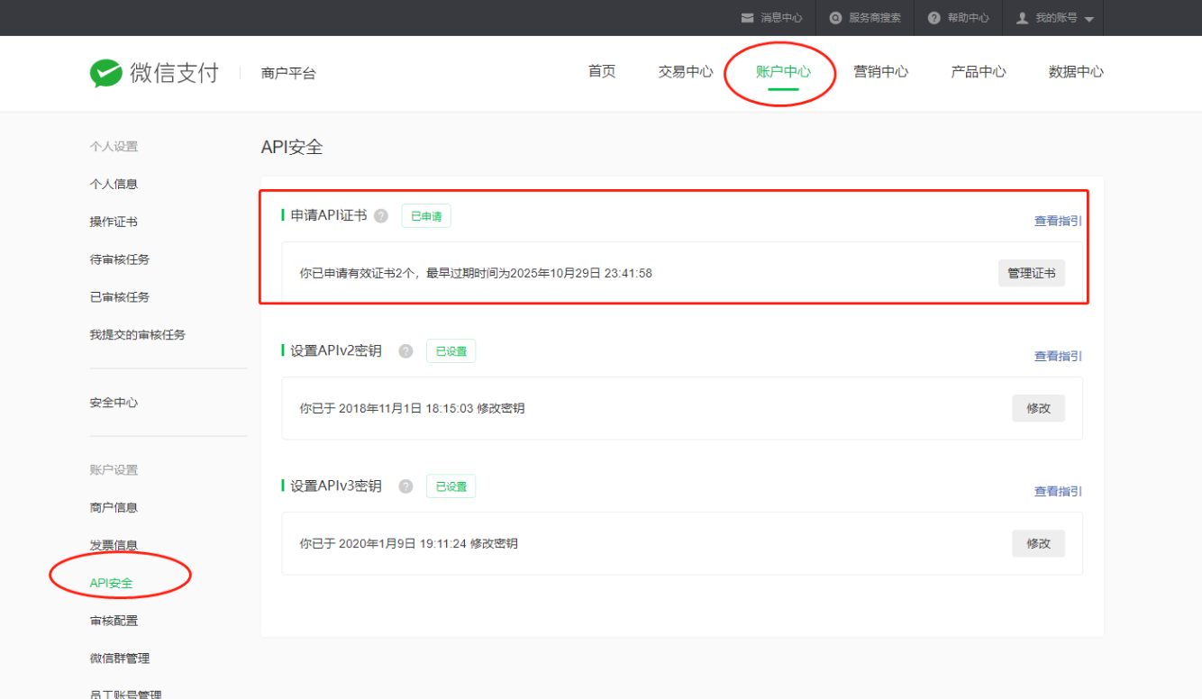 微信支付的两支付证书,若之前配置微信支付时已经下载过(商户号后台会显示管理证书,已申请有效证书xxx个),且商城后台有上传过证书,则无需重新申请、重新上传。这一步可直接跳过。